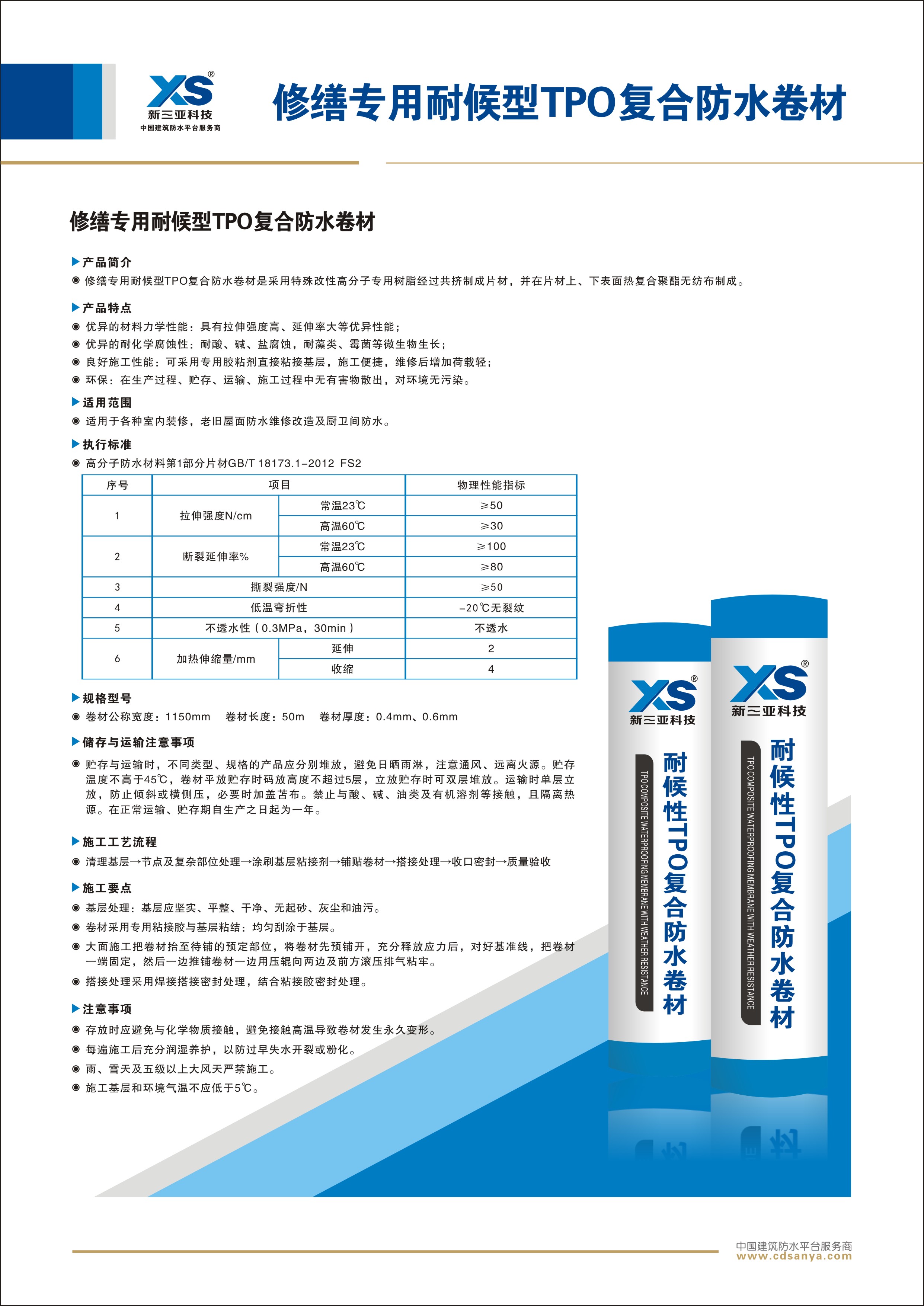 產(chǎn)品簡介: 修繕專用耐候型TPO復合防水卷材是采用特殊改性高分子專用樹脂經(jīng)過共擠制成片材,并在片材上、下表面熱復合聚酯無紡布制成。 規(guī)格:FS2-TPO-50.0m×1.15m×0.6mm | ![]() |
