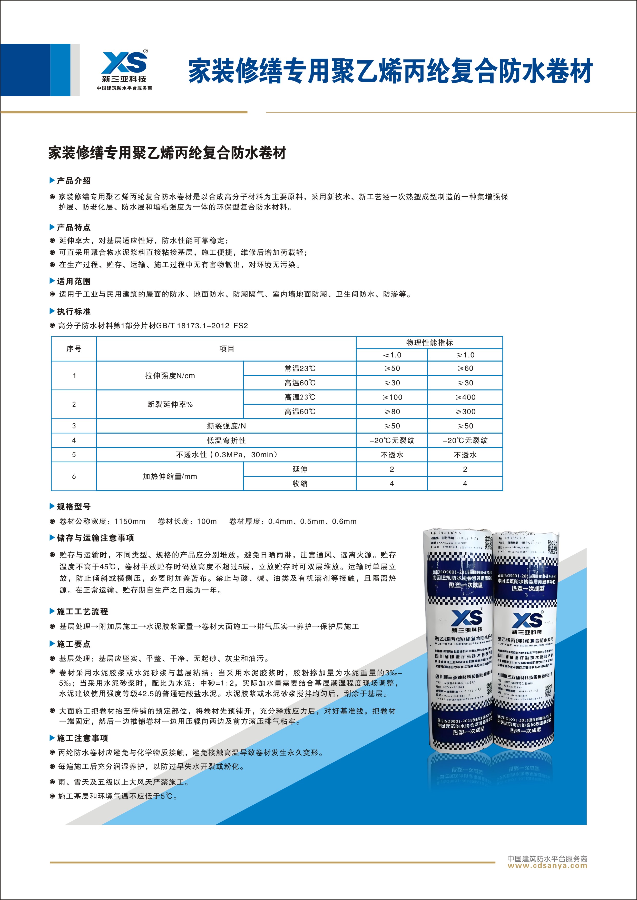 產(chǎn)品簡介: 乙烯丙綸復合防水卷材是以合成高分子材料為主要原料,采用新技術、新工藝經(jīng)一次熱塑成型制造的一種集增強保護層、防老化層、防水層和增粘強度為一體的環(huán)保型復合防水材料。 規(guī)格: FS2-PE-0.6mm 1.15m×100m | ![]() | ![]() |